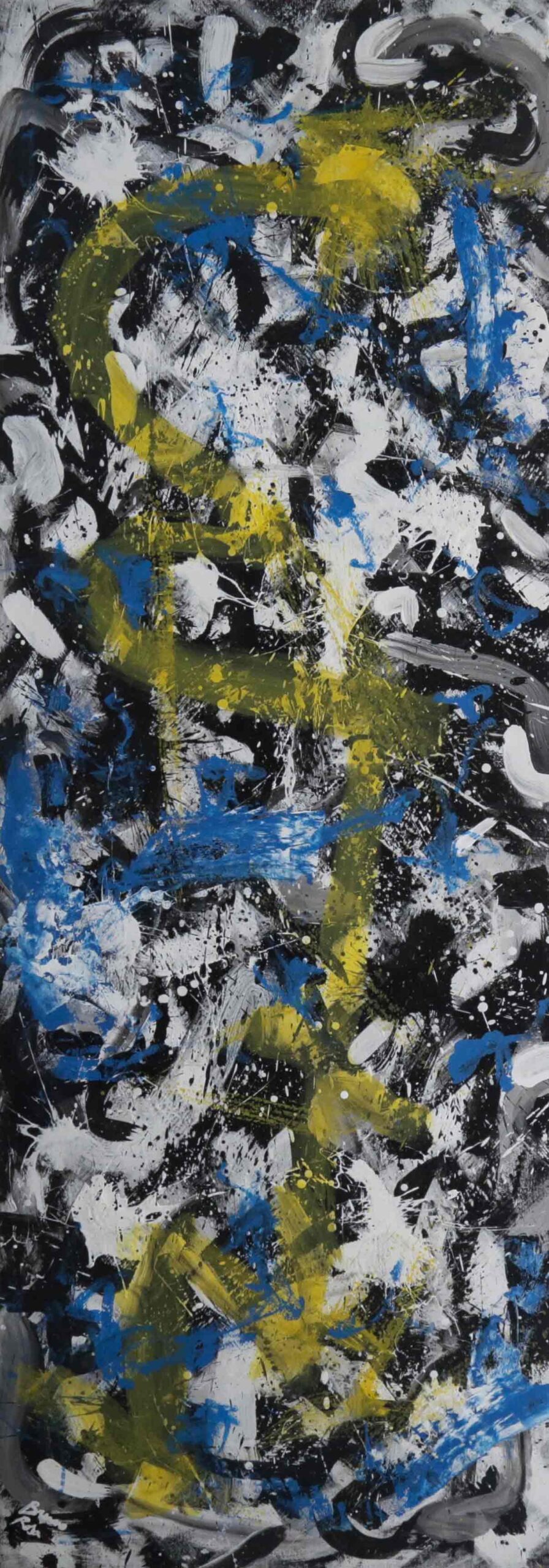 “IX” aka “Caminho Fraturado” mergulha o espectador num turbilhão de gestos, contrastes e pulsações cromáticas. Entre camadas de preto, branco e cinza — evocativas de um terreno instável e caótico — surgem traços vibrantes de amarelo e azul, que desenham uma trajetória hesitante, como uma travessia em busca de sentido. A composição vertical, de grande força física, impõe um movimento ascendente, quase como um impulso de superação ou resistência no meio da adversidade.